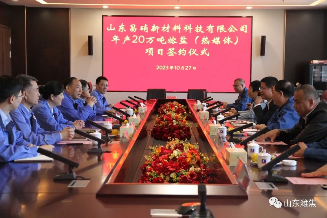 10月27日上午10:58分,山東昌硝新材料科技有限公司20萬噸/年熔鹽(熱媒體 )項目合作簽約儀式在集團總部舉 行。濰坊昌盛硝鹽投資公司董事長牟紅光、濰坊振興日升公司總經(jīng)理劉峰祥作為合作雙方代表進行簽約。朱劉街道黨工委書 記董建濤、昌樂縣化工產(chǎn)業(yè)發(fā)展服務中 心主任王俊鳳,集團董事長劉良玉、副總經(jīng)理呂紅,濰坊昌盛硝鹽投資控股公司負責人牟邦志等出席簽約儀式。簽約儀式由集團公司總經(jīng)理王讀福主持。