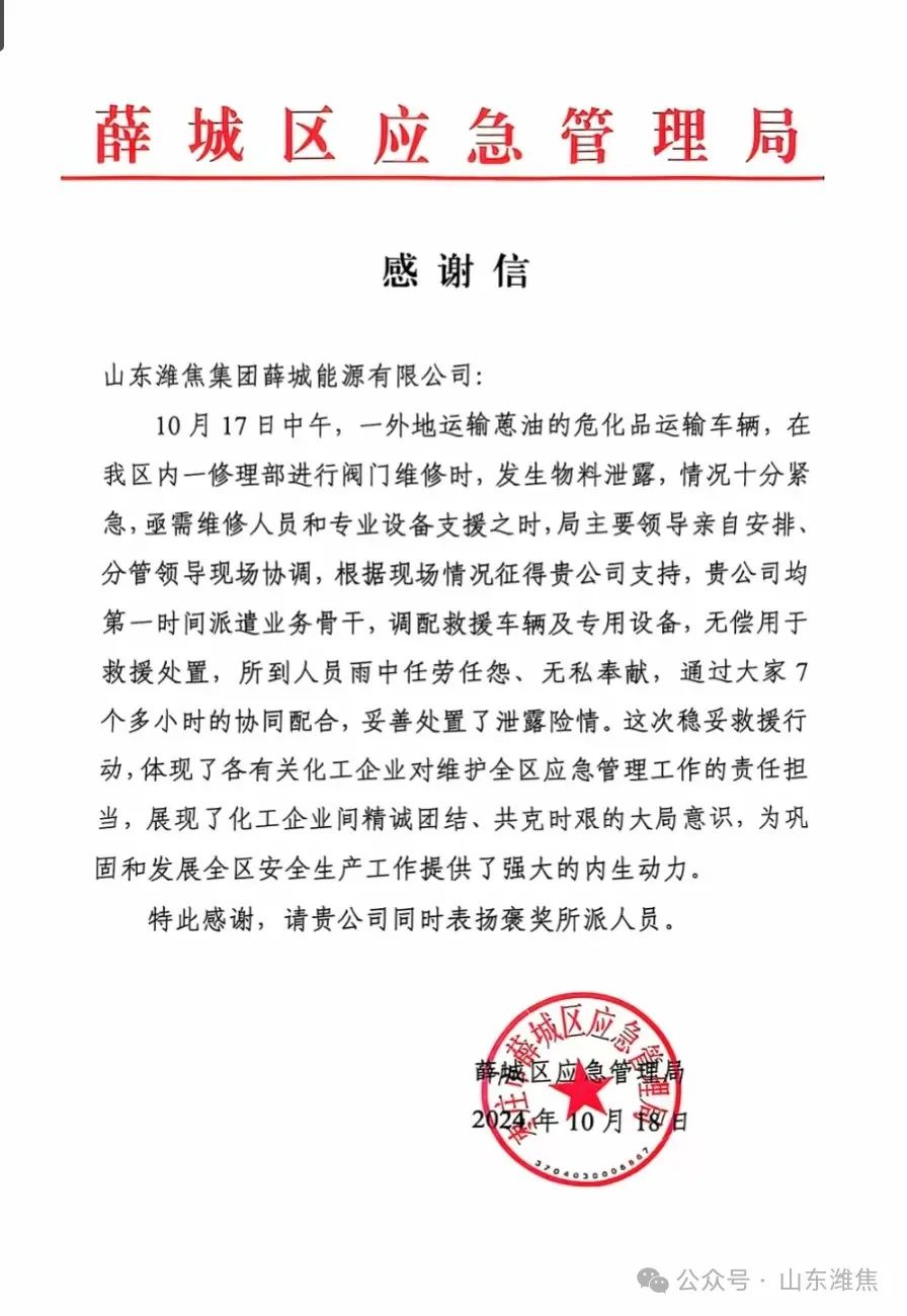 10月18日上午,薛城區(qū)應(yīng)急管理局黨 委書 記、局長王鋒,副局長張海龍一行向薛城能源公司送來感謝信,副總經(jīng)理陳兆財?shù)葻崆榻哟?/div>
